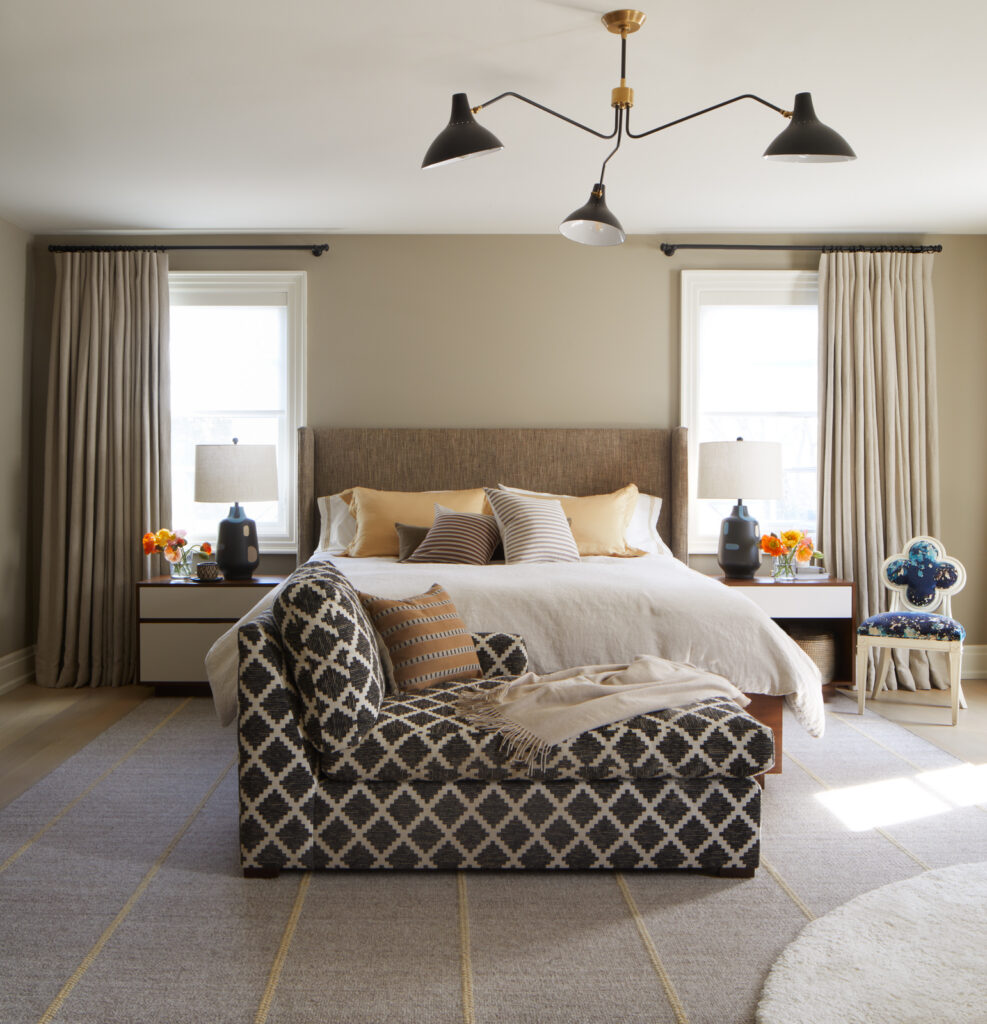 We like to pair our finishes with the headboard material so in this case, in the room above the heathered wool headboard blended beautifully with the oil rubbed bronze finish on the reading lights that complimented the ceramic base on the table lamps (rhythm and thread people, rhythm and thread!).